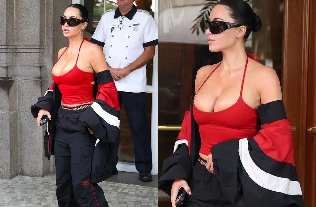 चेरी रेड स्किम्पी टैंक टॉप में Kim Kardashian का...