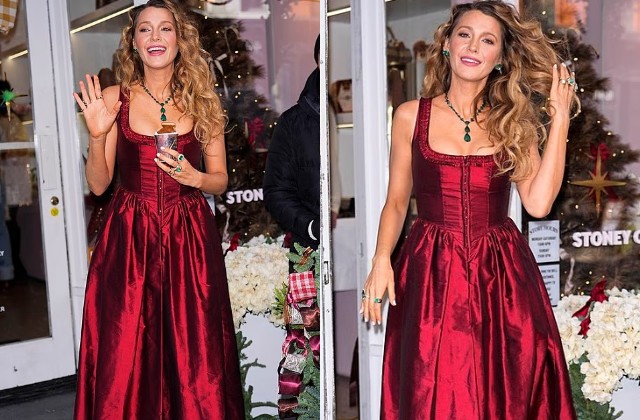 क्रिमसन रेड कॉर्सेट-स्टाइल ड्रेस में ब्लेक लाइवली...