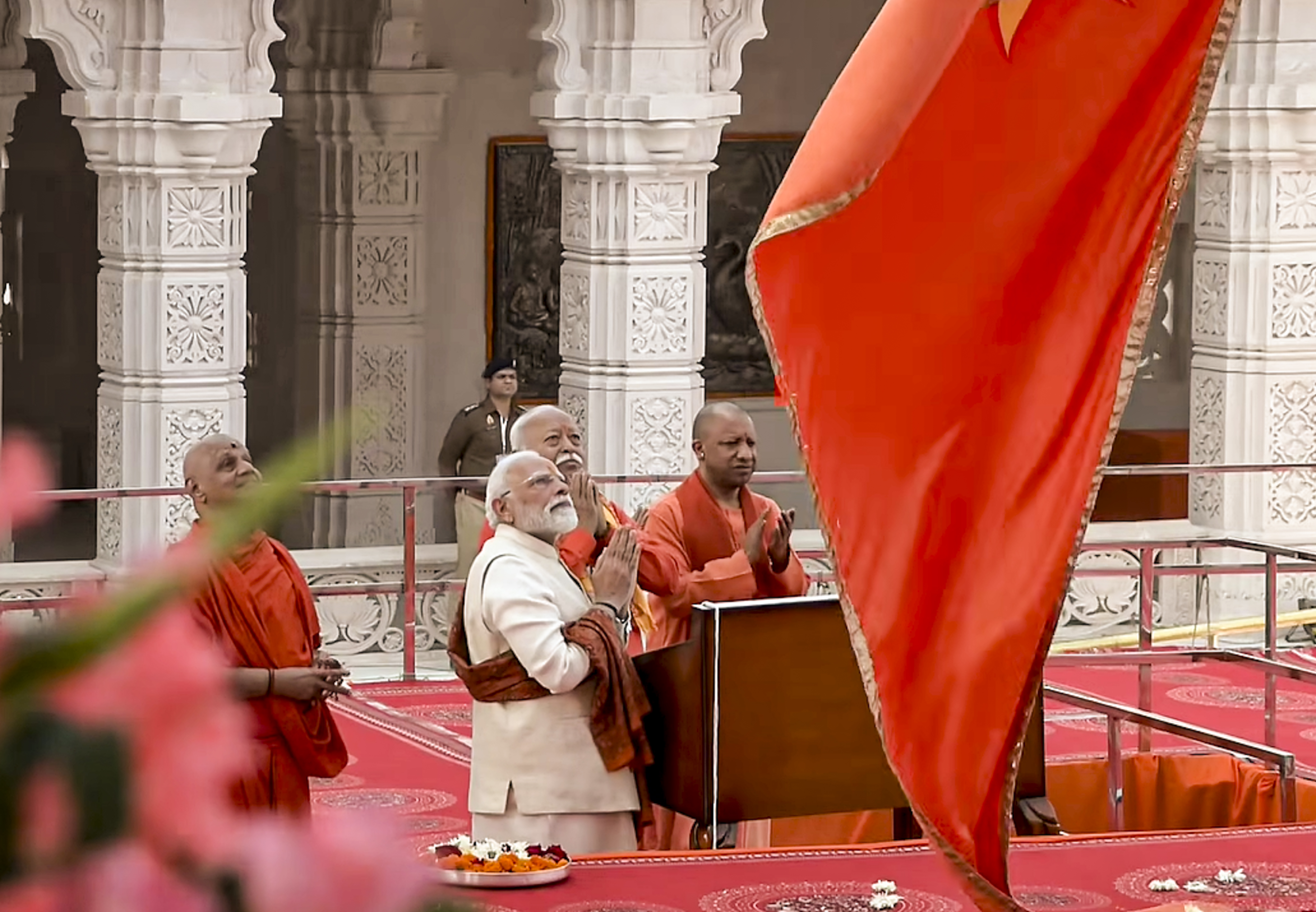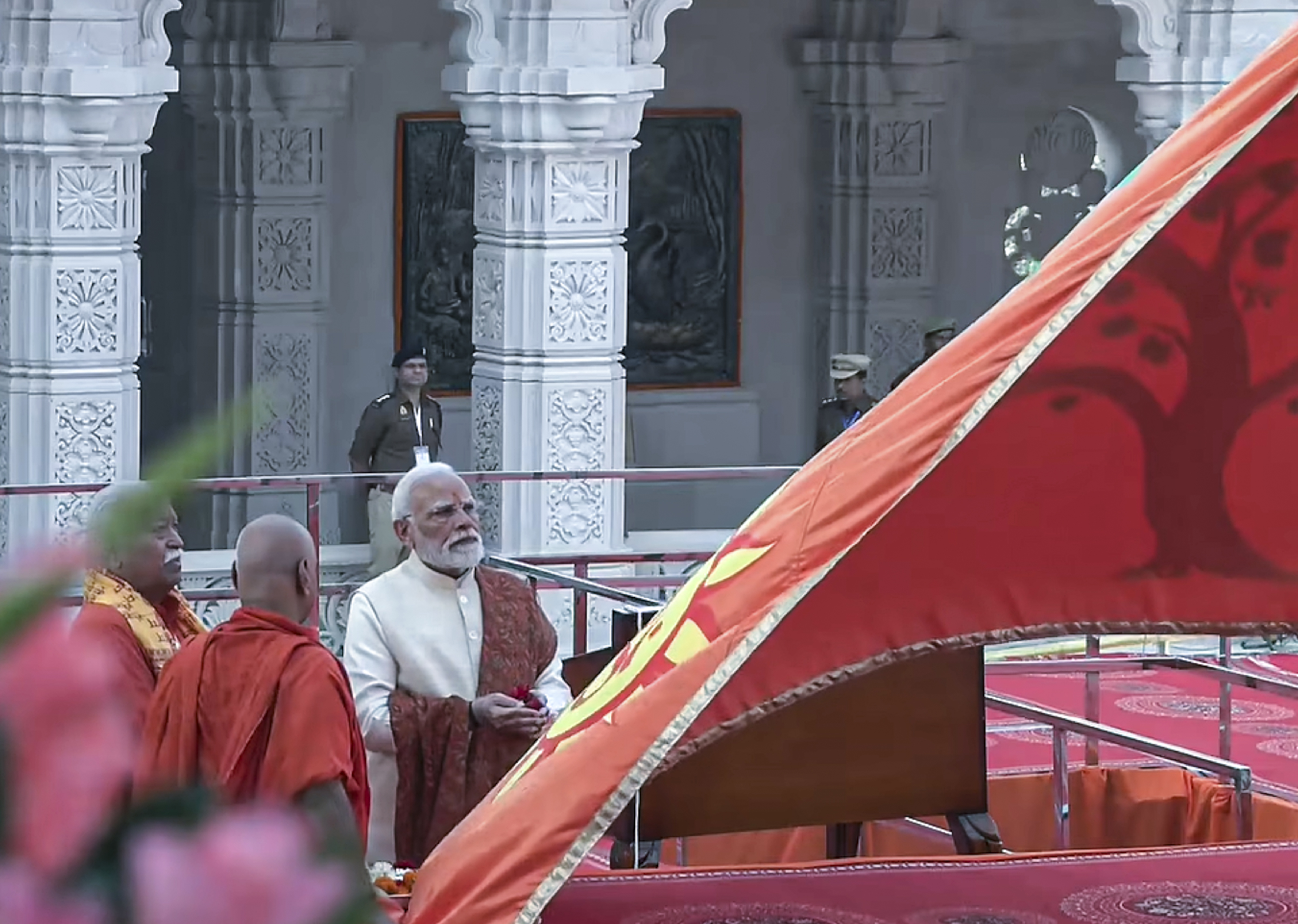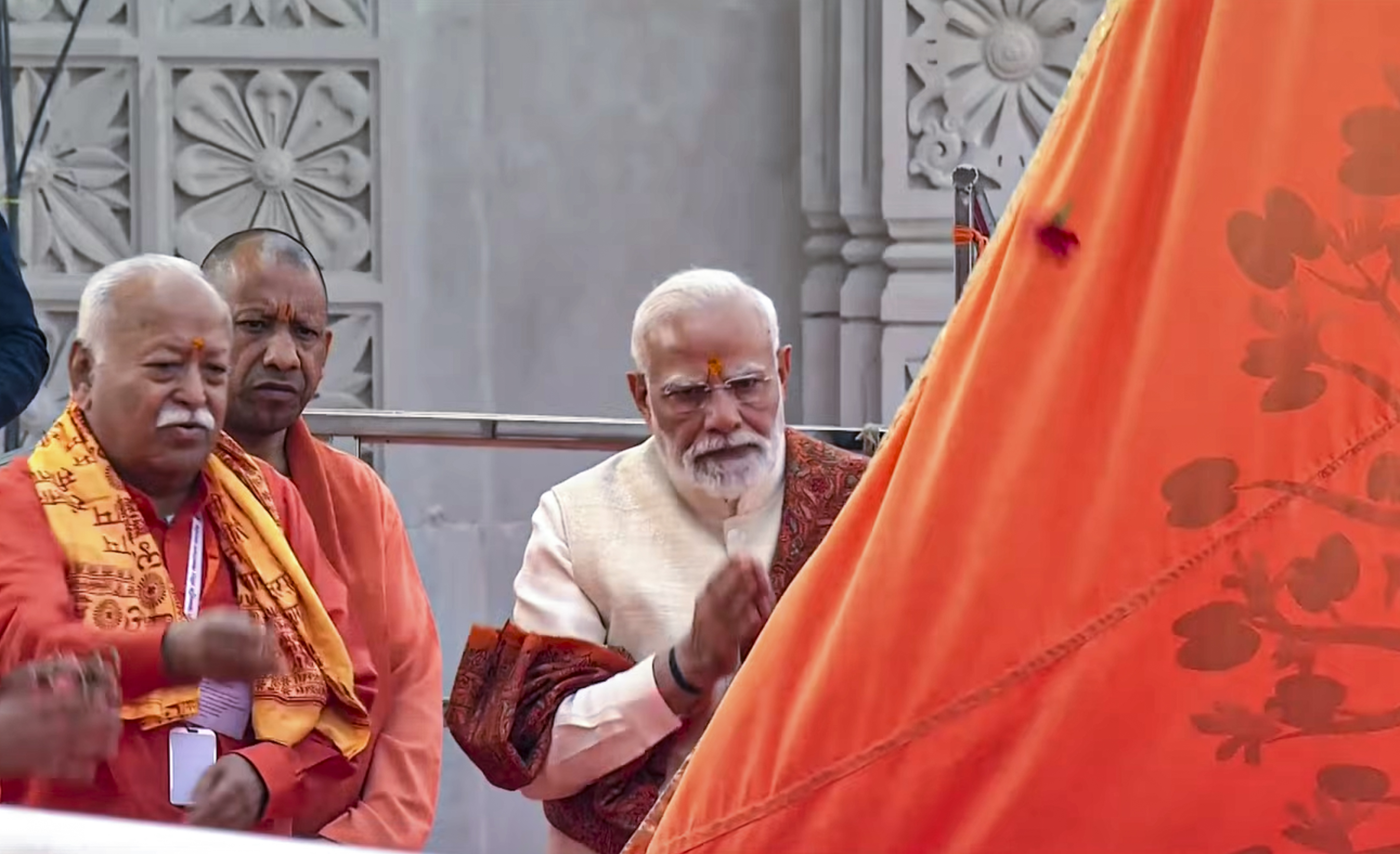प्रधानमंत्री मोदी और आरएसएस सरसंघचालक मोहन भागवत ने पवित्र श्री राम जन्मभूमि मंदिर के शिखर पर औपचारिक रूप से भगवा ध्वज फहराया, जो मंदिर निर्माण के पूर्ण होने का प्रतीक है।
