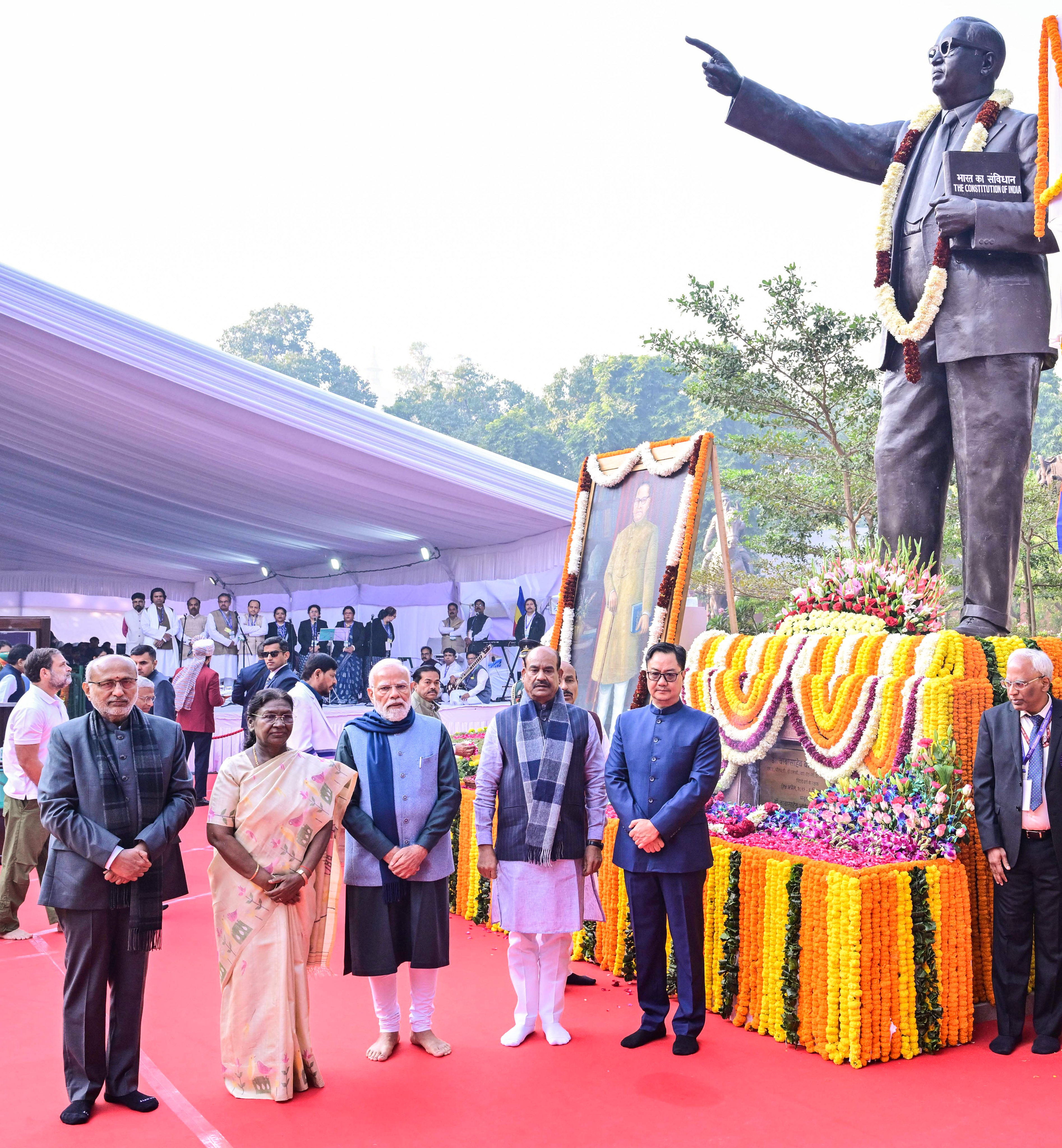 प्रधानमंत्री नरेंद्र मोदी, उपराष्ट्रपति सीपी राधाकृष्णन और अन्य नेताओं ने संसद भवन परिसर में डॉ. आंबेडकर की प्रतिमा पर विनम्र श्रद्धांजलि अर्पित की।