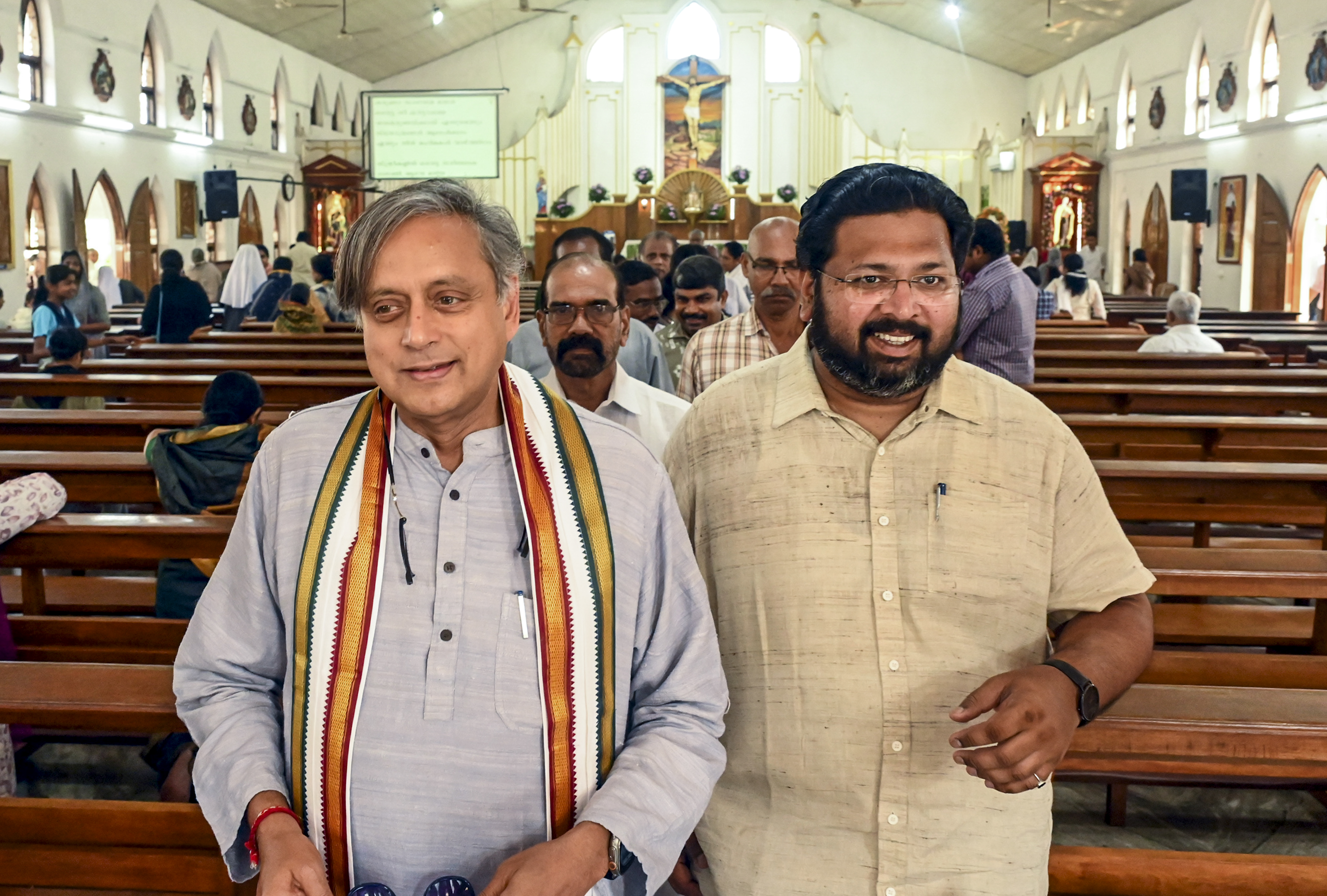 कांग्रेस नेता शशि थरूर और यूडीएफ उम्मीदवार के.एस. सबरीनाधन, तिरुवनंतपुरम में सेंट थेरेसा ऑफ लिसीक्स कैथोलिक चर्च में गए