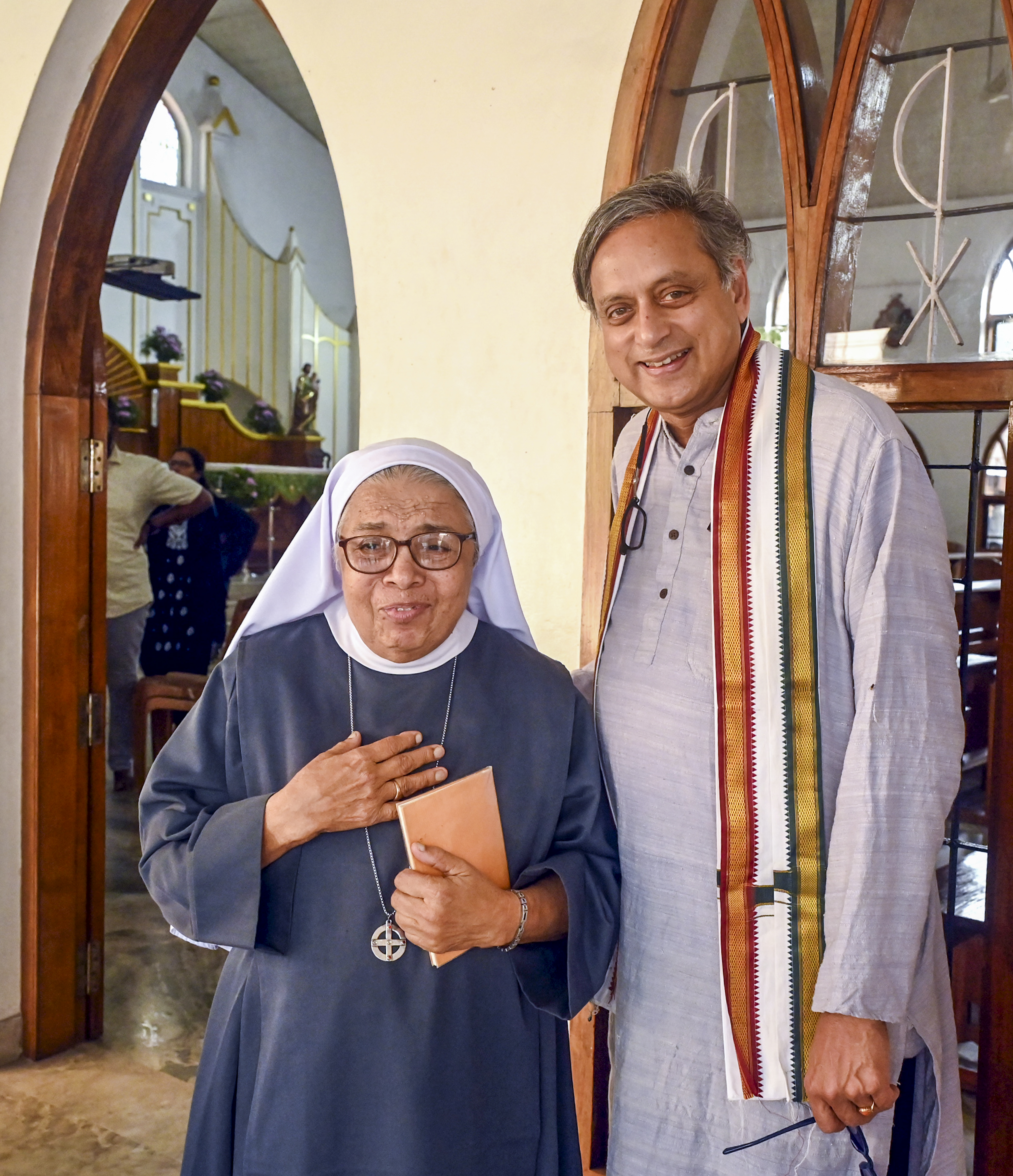 कांग्रेस नेता शशि थरूर सेंट थेरेसा ऑफ लिसीक्स कैथोलिक चर्च की यात्रा के दौरान एक नन के साथ तस्वीर खिंचवाई