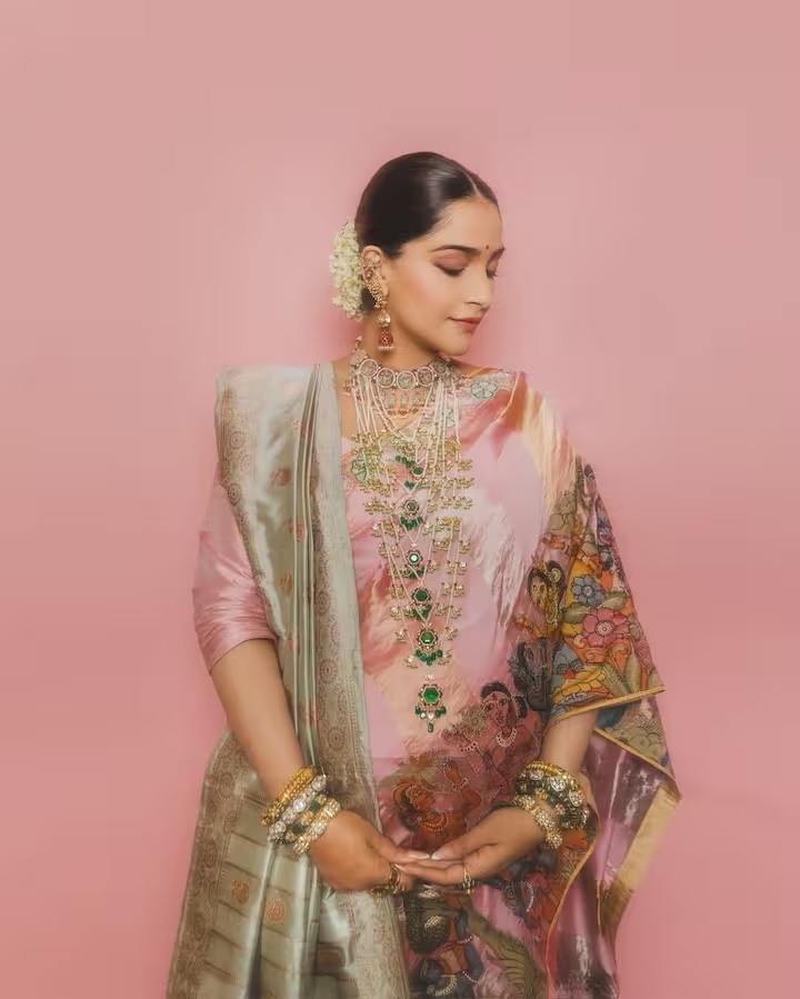 फोटोशूट में सोनम कपूर ने पिंक रंग की खूबसूरत कलमकारी साड़ी पहनी है।