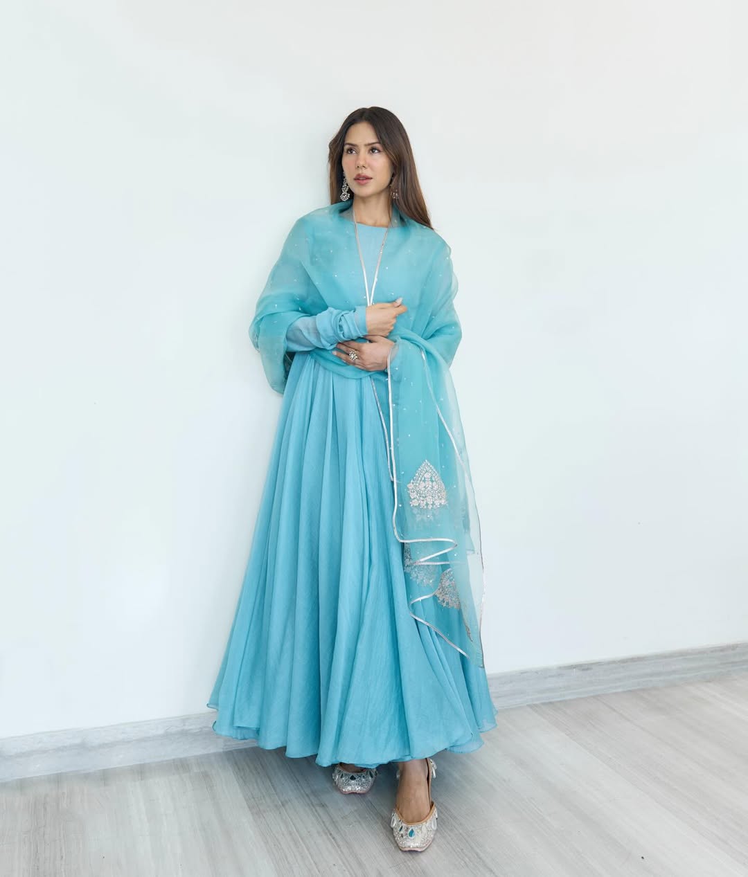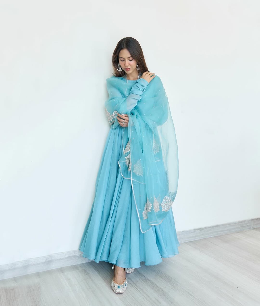प्लेन सिंपल अनारकली सूट के साथ सोनम के एक मैचिंग का दुप्पटा लिया हुआ है। दुपट्टे पर बारीक बूटी वर्क और किनारों पर चांदी की महीन गोटा-पट्टी का काम किया गया है, जो सादगी में चमक का तड़का लगा रहा है।