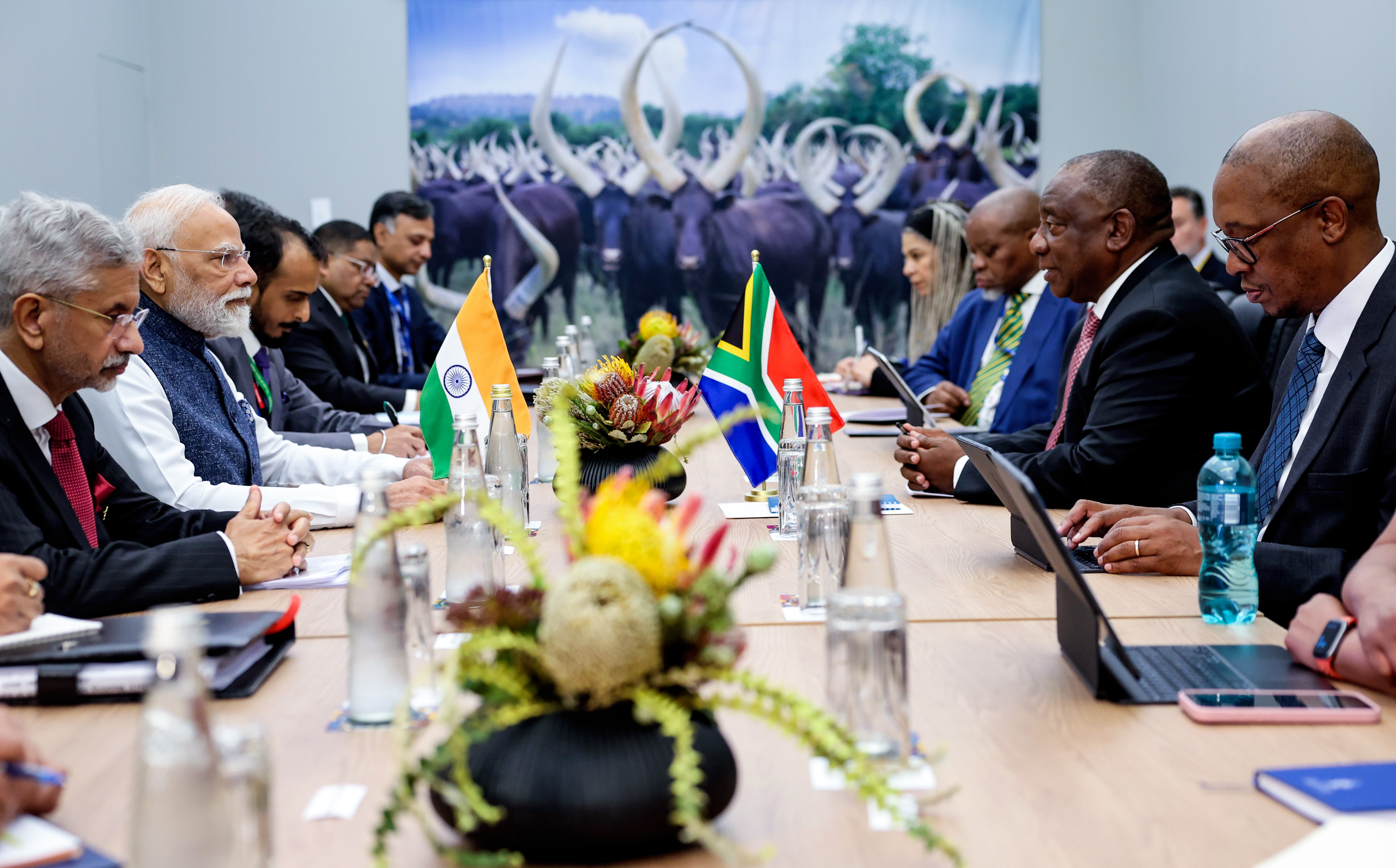 प्रधानमंत्री नरेंद्र मोदी जोहान्सबर्ग में दक्षिण अफ्रीका के राष्ट्रपति सिरिल रामफोसा के साथ द्विपक्षीय बैठक की।