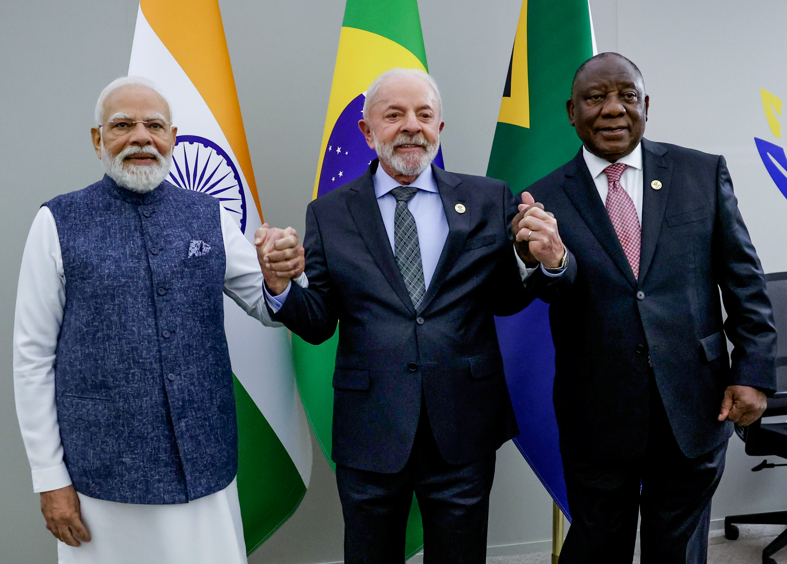 प्रधानमंत्री नरेंद्र मोदी, दक्षिण अफ्रीका के राष्ट्रपति सिरिल रामफोसा और ब्राजील के राष्ट्रपति लुई इनासियो लूला दा सिल्वा के साथ, दक्षिण अफ्रीका के जोहान्सबर्ग में जी20 शिखर सम्मेलन के दौरान।