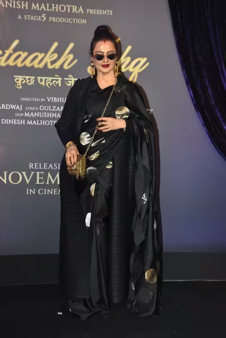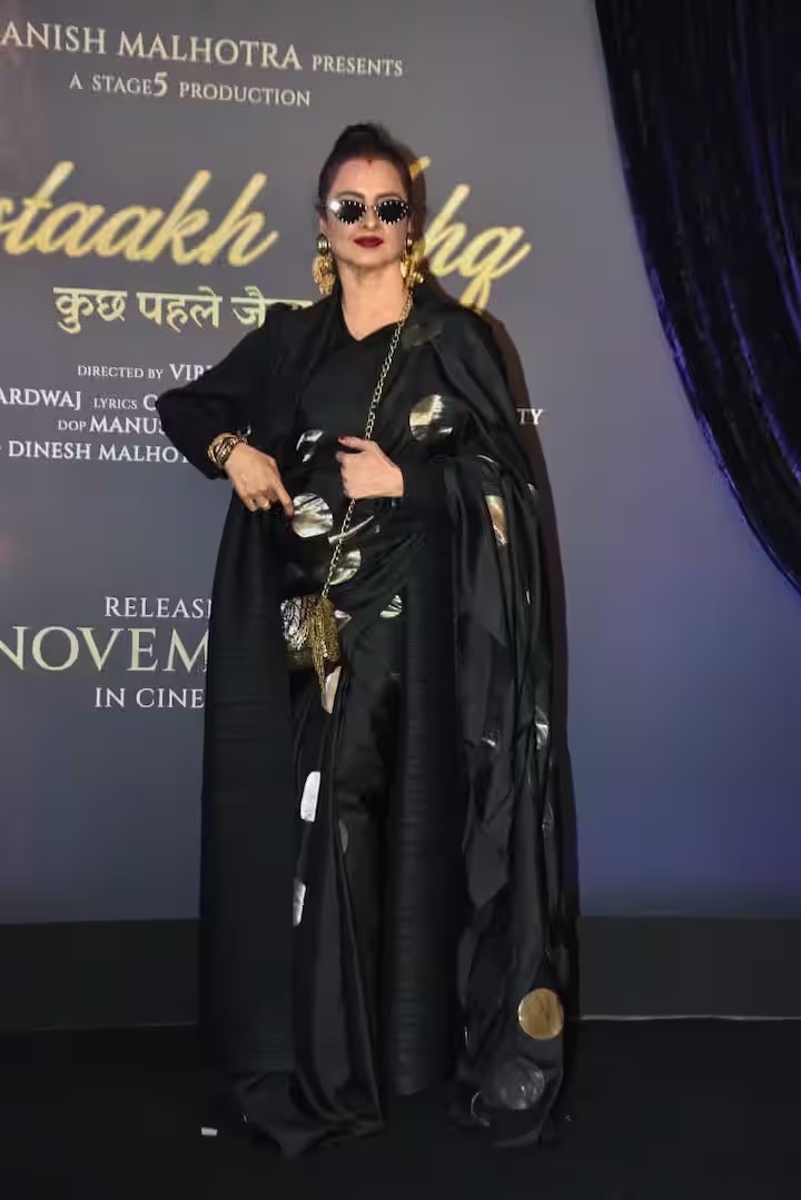 मांग में सिंदूर, आंखों पर काला चश्मा और हाई बन..‘गुस्ताख इश्क’ की स्क्रीनिंग छाईं रेखा, ब्लैक साड़ी में दिखा रॉयल अंदाज