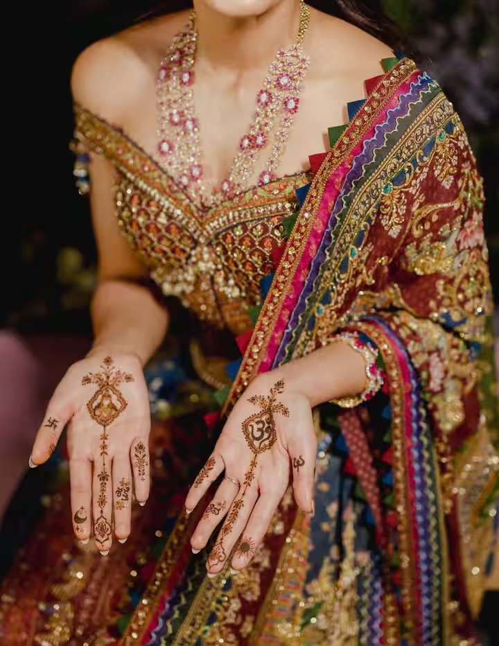 मेहंदी समारोह के दौरान रश्मिका मंदाना ने मशहूर डिजाइनर करण तोरानी के लेबल ‘तोरानी इंडिया’ की डिजाइन की हुई खूबसूरत मल्टीकलर साड़ी पहनी।