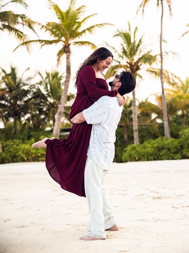 तस्वीरों में देखा जा सकता है कि सोनाक्षी और जहीर मालदीव के समंदर किनारे मस्ती करते नजर आ रहे हैं।