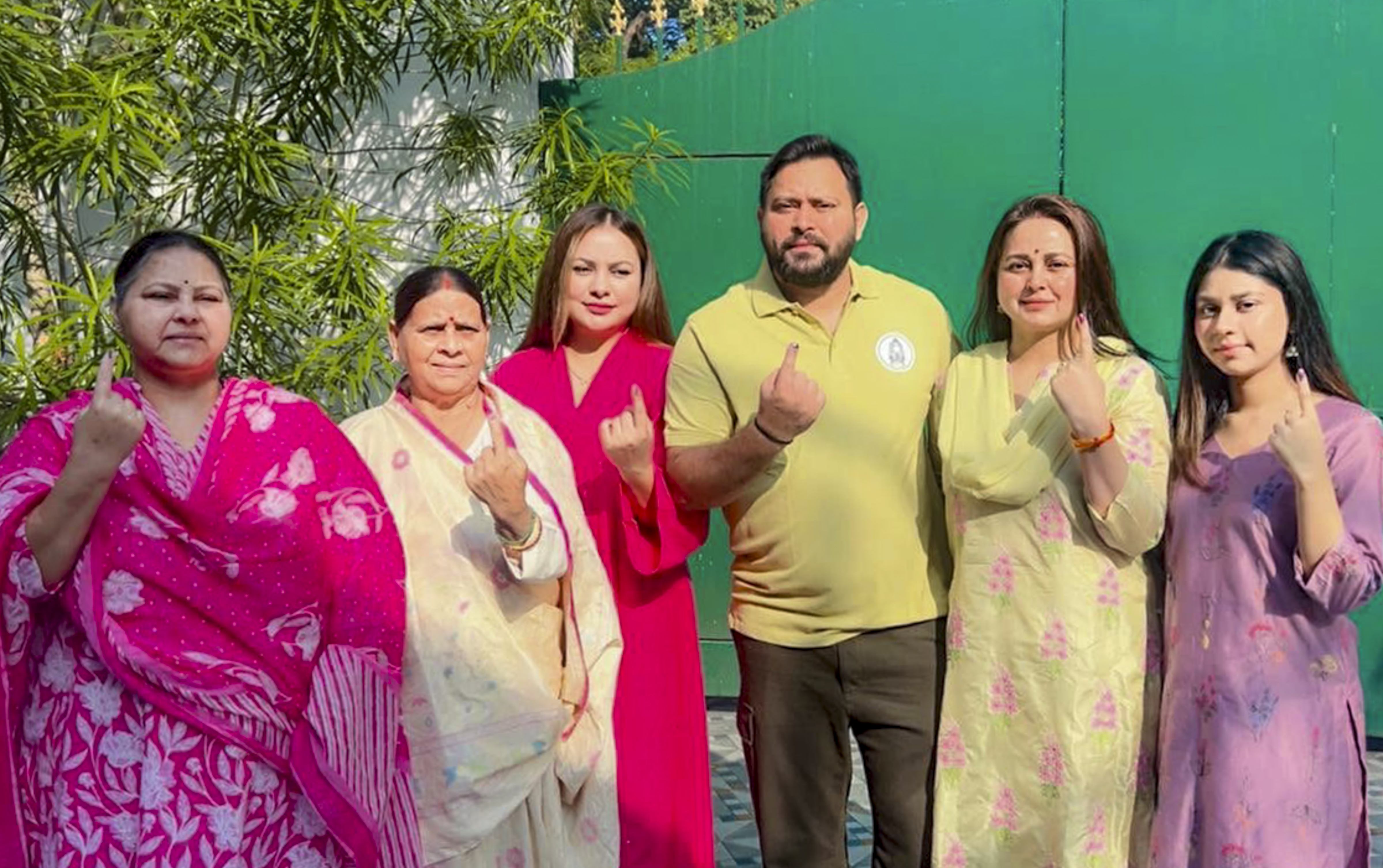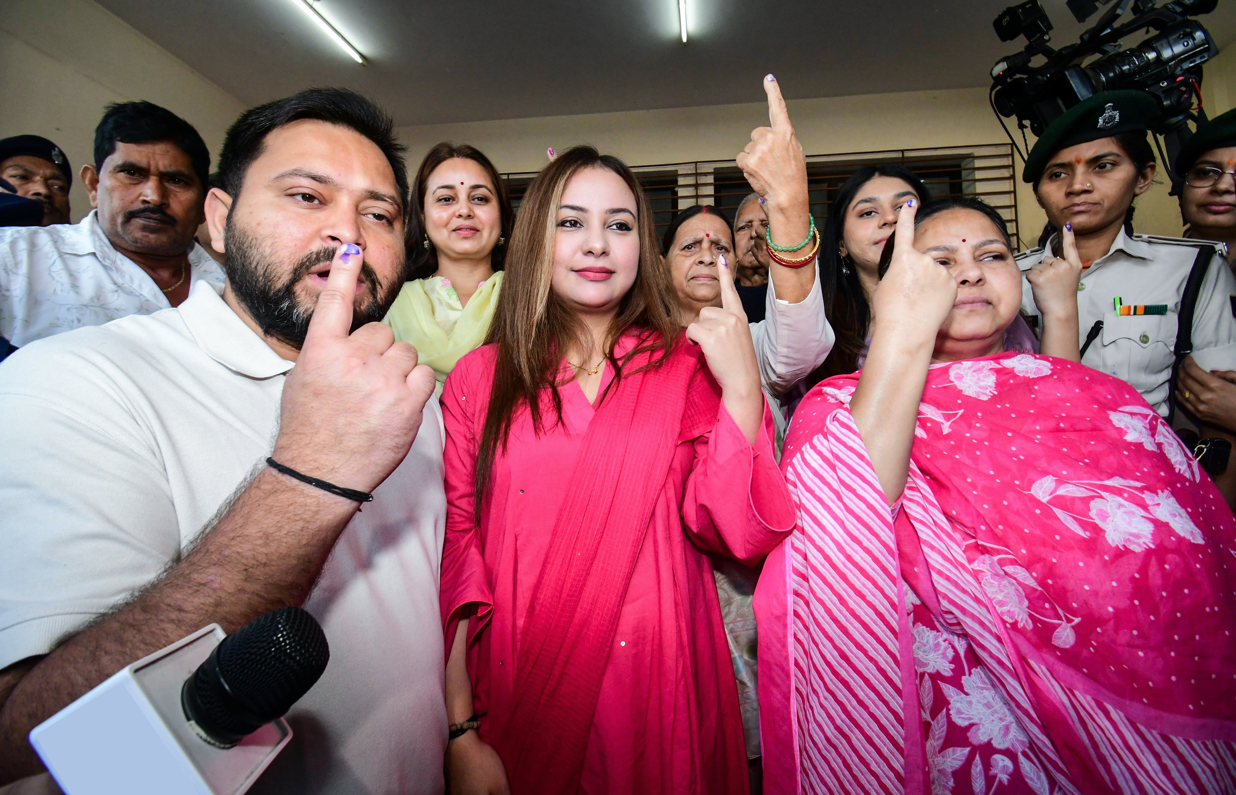 राजद नेता तेजस्वी यादव ने अपने पिता और राजद सुप्रीमो लालू प्रसाद तथा परिवार के अन्य सदस्यों के साथ पटना के वेटरनरी कॉलेज स्थित बूथ पर मतदान किया।