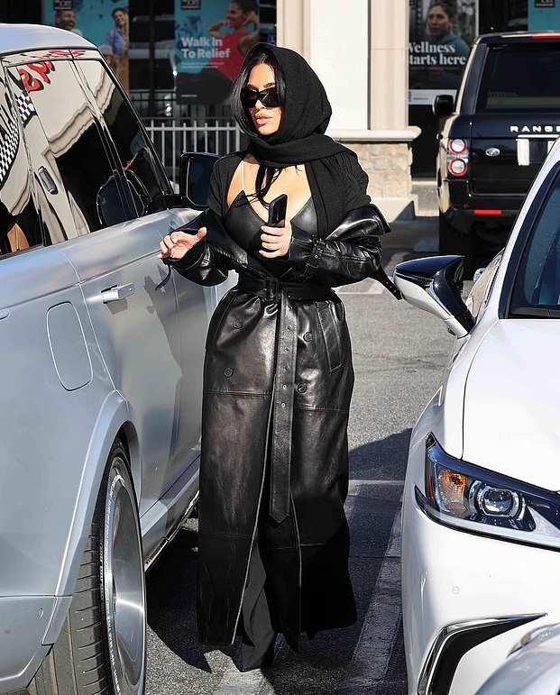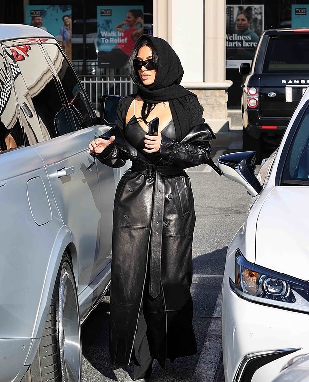 उन्होंने ब्लैक लेदर आउटफिट पहना, जिसमें एक छोटा सा टॉप और उसके ऊपर लेदर कोट शामिल था।