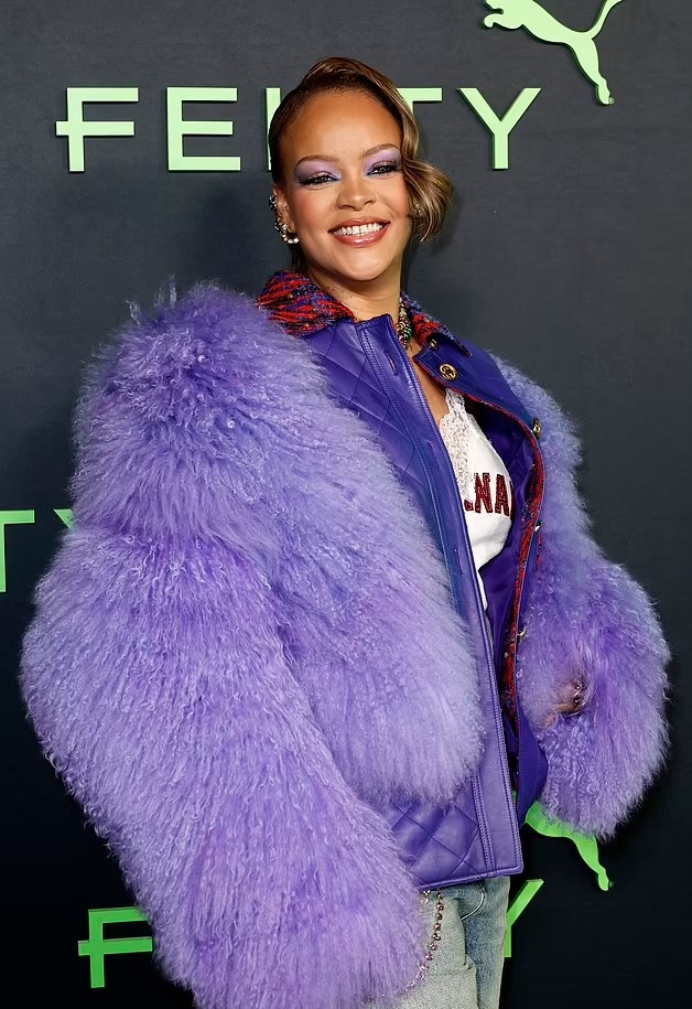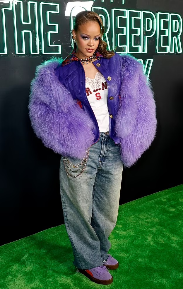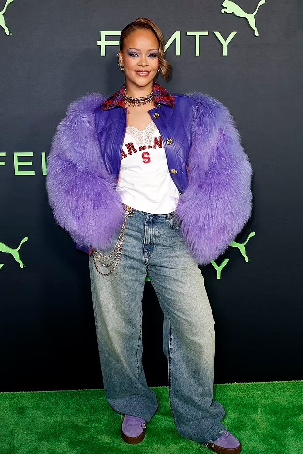 लुक की बात करें तो रिहाना व्हाइट टी-शर्ट टाॅप, ब्लू जींस और फर्र वाली पर्पल जैकेट में कमाल की लग रही हैं।