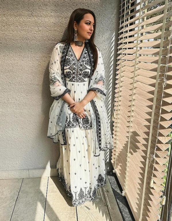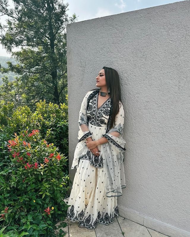 इन तस्वीरों में देखा जा सकता है कि सोनाक्षी व्हाइट शरारा सूट में नजर आ रही हैं, जिस पर ब्लैक धागे का वर्क किया गया है।