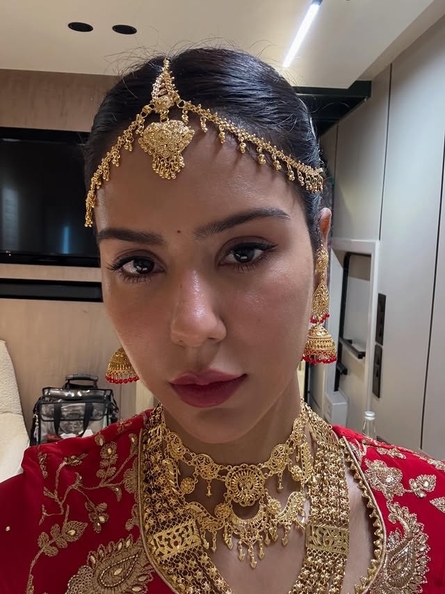 उन्होंने अपने ब्राइडल लुक को गोल्डन ज्वेलरी के साथ कंप्लीट किया है, जो उनके पूरे लुक में रॉयल टच जोड़ रहा है।
