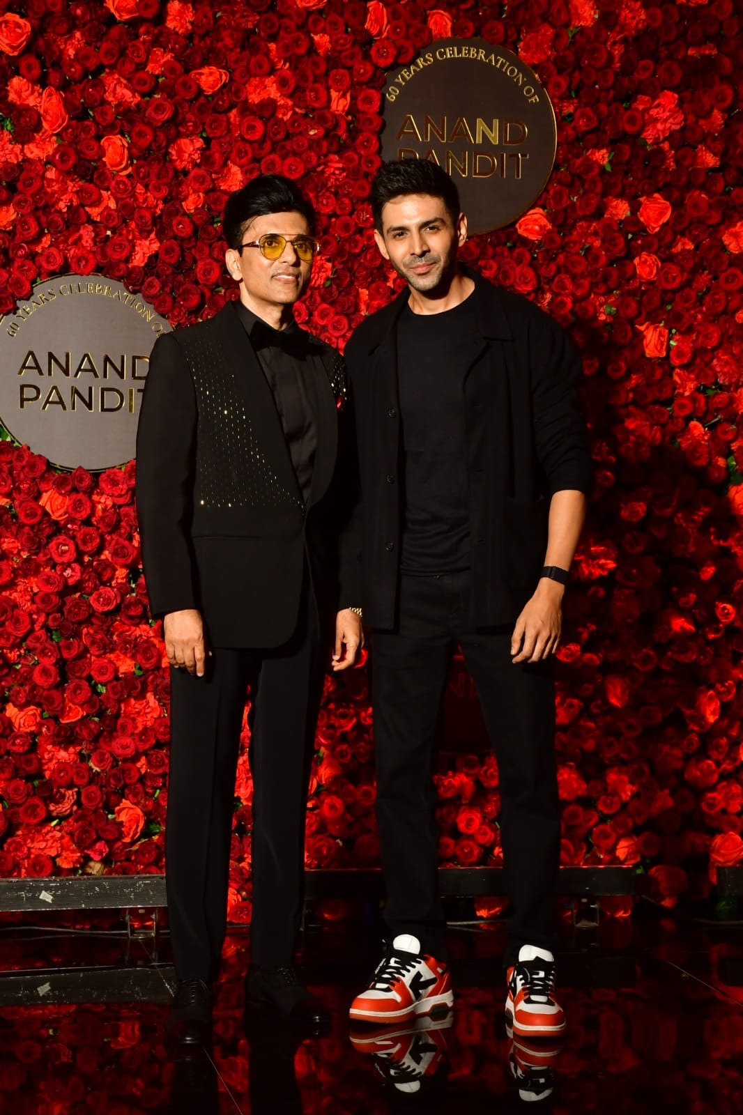 कार्तिक आर्यन प्रोड्यूसर आनंद पंडित के साथ पोज देते हुए दिखे।