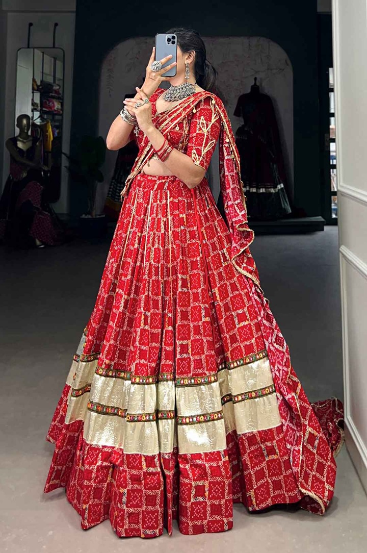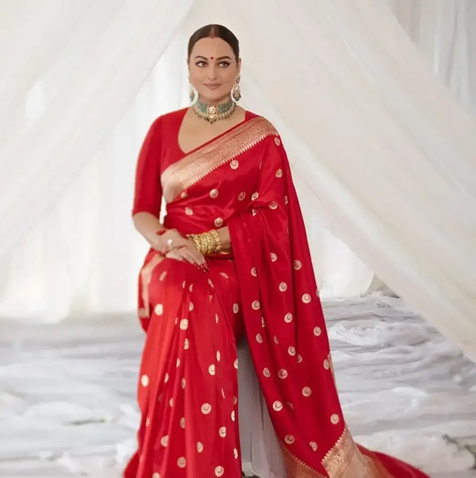 रेड सिल्क साड़ी विद गोल्ड ज्वेलरी