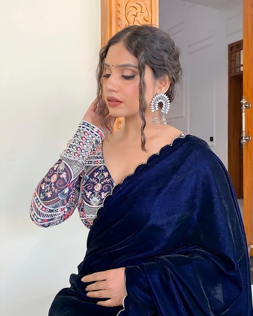 नेवी ब्लू वेलवेट साड़ी सीक्विन ब्लाउज़ के साथ