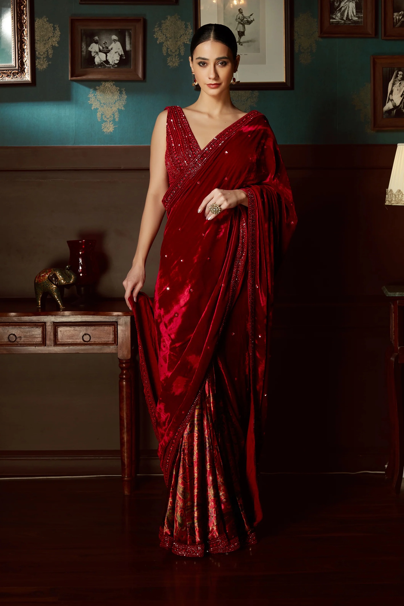 हॉट रेड या सिंदूरी वेलवेट साड़ी