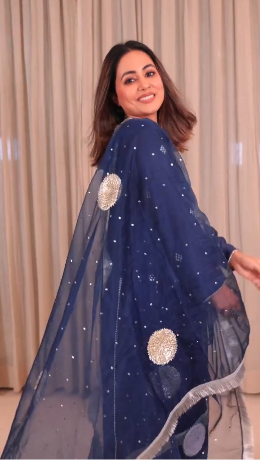 हिना ने एक ब्लू कलर का प्लाजो सूट पहना था, जिसपर सिल्वर वर्क था और इसके दुपट्टे पर भी गोटा पट्टी लगी थी।