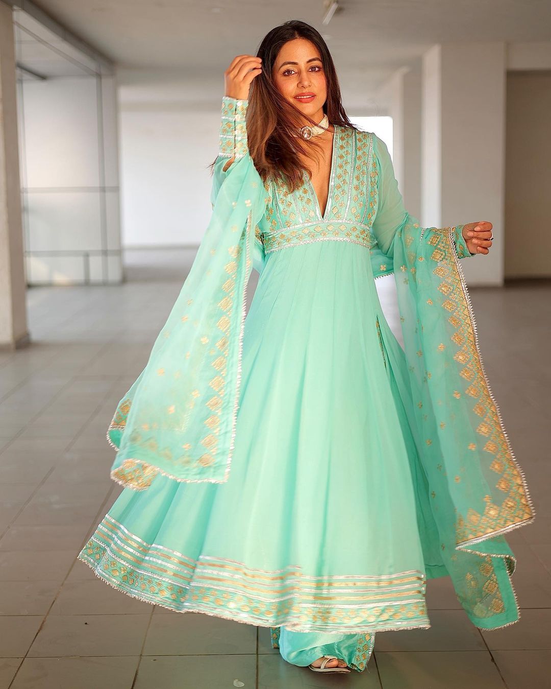 हिना ने एक स्काई ब्लू कलर का अनारकली स्टाइल सूट भी पहना था।