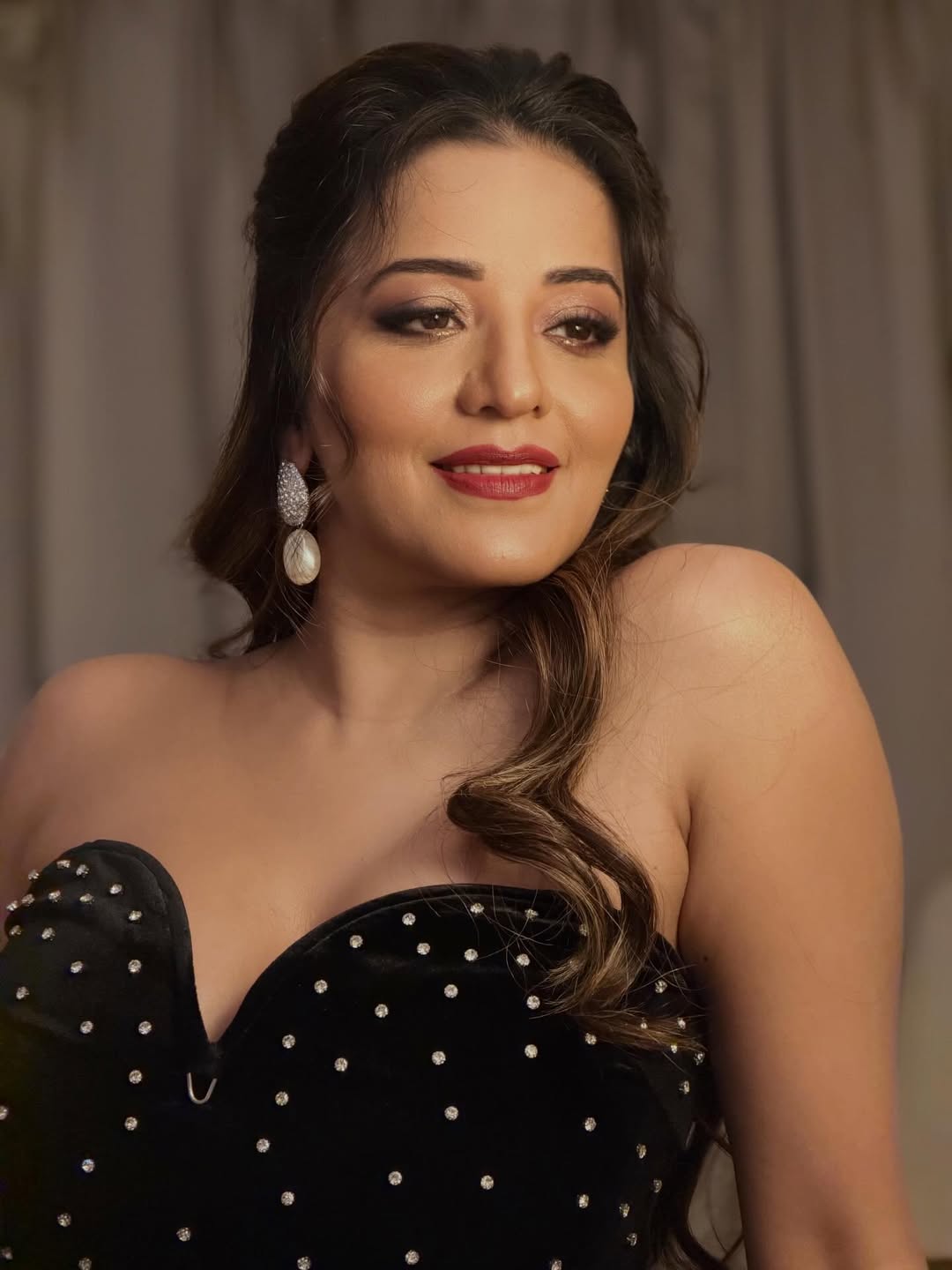Monalisa का मेकअप इस पूरे लुक की जान है। उन्होंने 'विंग्ड आईलाइनर' और 'स्मैश रेड' लिपस्टिक के साथ अपने चेहरे को काफी शार्प लुक दिया है। उनके बालों को 'हाफ-अप, हाफ-डाउन' स्टाइल में बांधा गया है, जिसमें उनकी कुछ लटें उनके चेहरे पर गिर रही हैं, जो उनकी खूबसूरती में चार चांद लगा रही हैं।