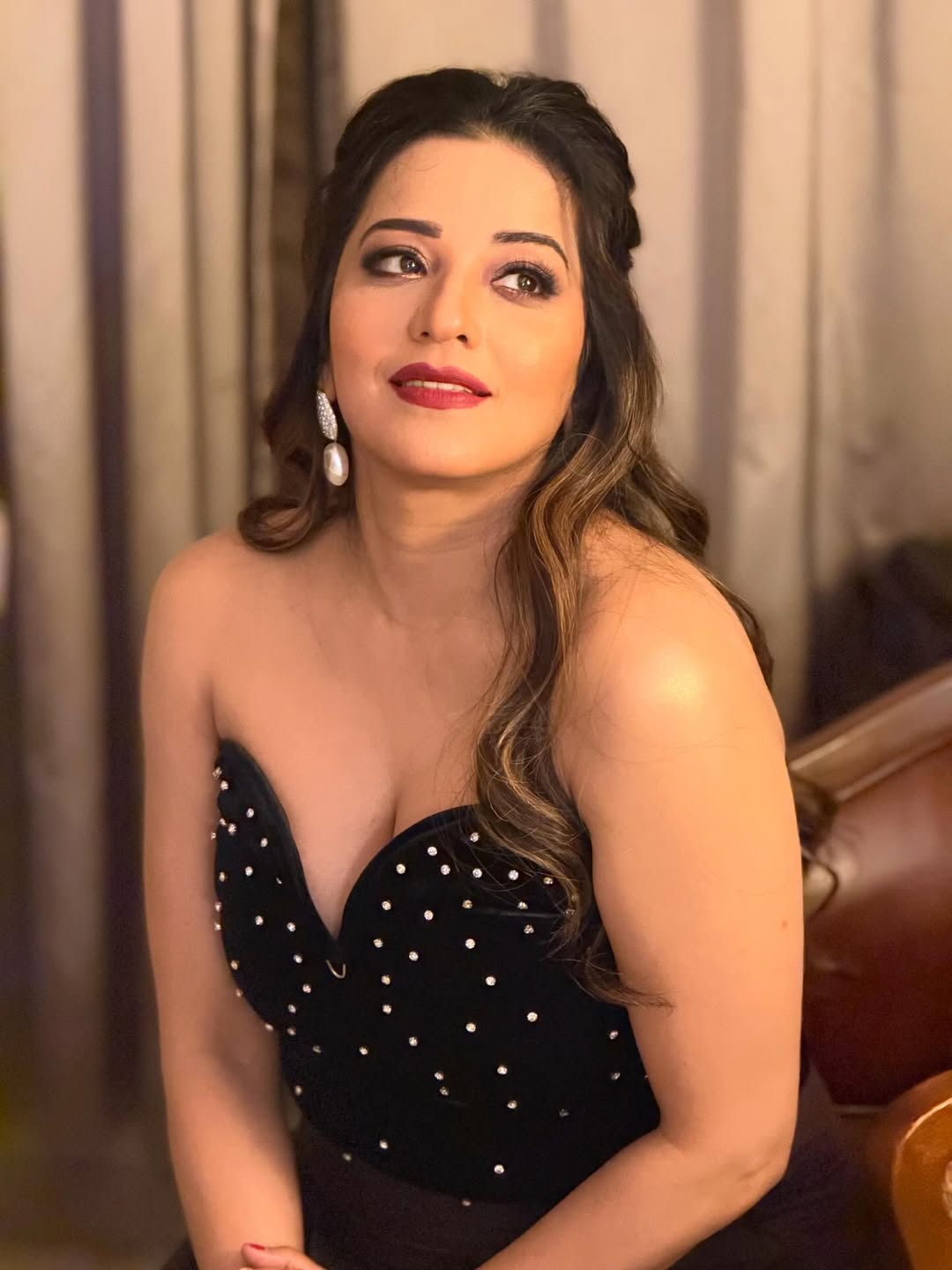 इन तस्वीरों में मोनालिसा ने एक बेहद स्टाइलिश ब्लैक वेलवेट कॉर्सेट टॉप पहना हुआ है, जिस पर चमकीले स्टोन या बीड्स का बारीकी से काम किया गया है। यह टॉप उनके लुक को एक रॉयल और विंटेज टच दे रहा है।